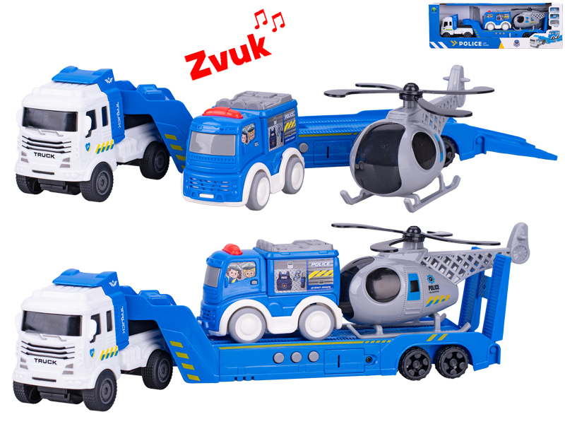 Auto nákladní 30cm na setrvačník na baterie se zvukem + vozidla policie 2ks v krabičce