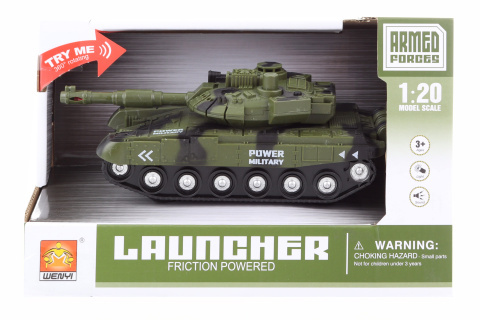 Plastový tank o rozměru cca 17 x 7,5 x 8 cm na baterie. Napájení 3x AG13/LR44 baterie které jsou součástí. Tank po stisknutí knoflíku svítí a vydává zvuky. Rozměr balení cca 24 x 11 x 15,5 cm. Věk 3+