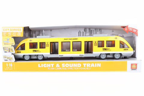 Plastový vlak na baterie. Vlak vydává zvuky a svítí. Rozměry cca 44,5 x 5,8 x 9 cm. Napájení na 3 AG13 baterie (jsou součástí). Rozměry balení cca 48 x 11 x 16,5 cm. Věk 3+ číst celé