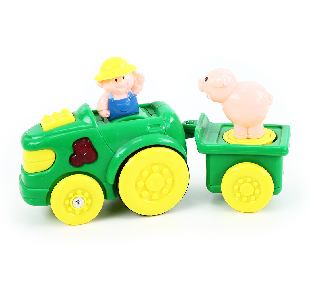 Traktor s vozíkem a zvířátkem. Zmáčknutím tlačítka traktor hraje melodie a prasátko se otáčí. Traktor vyžaduje 2 ks baterií typu AA, které nejsou součástí balení.
