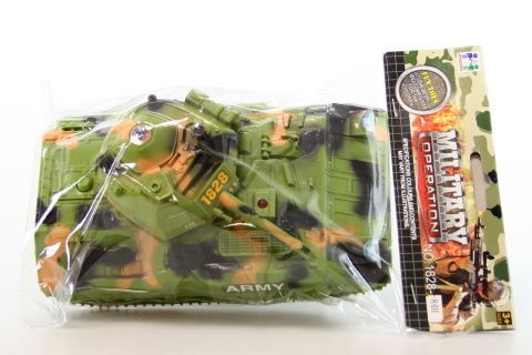 Armádní tank na baterie. Napájení na knoflíkové baterie (jsou součástí balení). Po stisknutí tlačítka začne tank vydávát zvuky a blikat. Rozměr tanku cca 20 x 11 cm. Rozměr balení cca 26 x 17 cm. Věk 3+