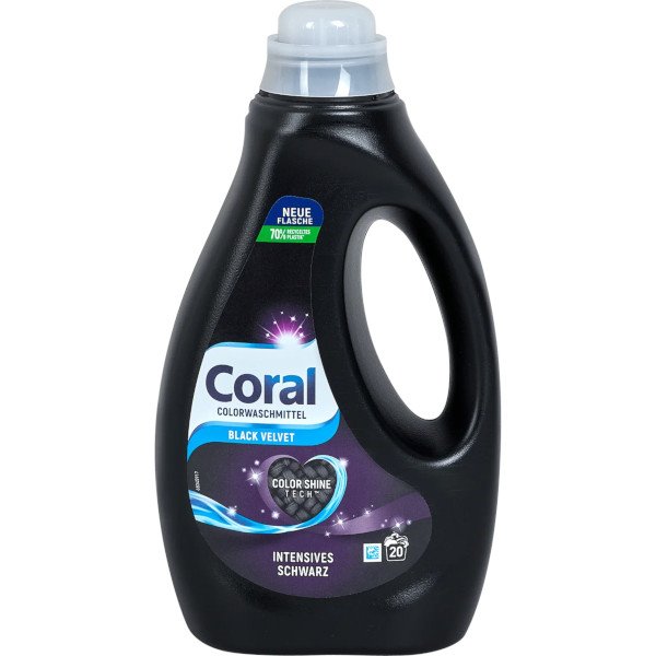 Coral Black Velvet - prací gel na černé prádlo - 20PD - 1lS tekutým pracím prostředkem Coral zůstane vaše oblíbené černé oblečení déle jako nové. Černá často po pár praních vybledne a barva vypadá rychle sepraná. S pracím prostředkem Black Velvet color od Coral zůstane barva vašeho tmavého oblečení zachována díky technologii Color Shine.Coral Black Velvet šetrně vyčistí vaše oblíbené černé oblečení až do hloubky vláken. Jedinečné složení působí již při teplotě od 30 °C do 60°C a dodává vašemu oblečení svěží a dlouhotrvající vůni.Společnost Coral byla založena v roce 1929 v Německu jako výrobce pracích přípravků. Od svého založení se společnost Coral zaměřovala na inovace a vývoj produktů s vysokou účinností pro domácí praní. Během let se společnost rozrostla a rozšířila svou působnost do celého světa a stala se jedním z předních výrobců pracích přípravků. V současné době společnost Coral nabízí široký sortiment produktů pro praní, včetně pracích prášků, aviváží, pracích gelů a mnoha dalších.