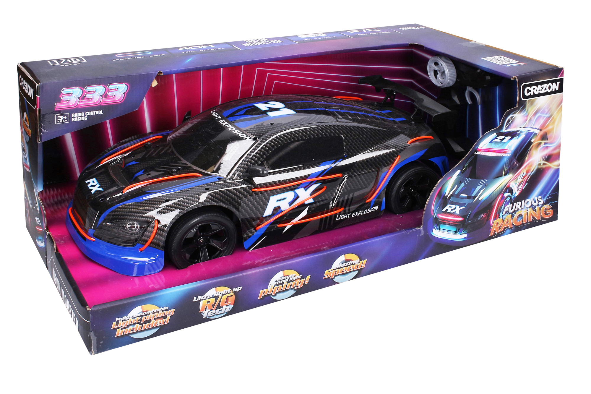 Auto Light Explosion RC na dálkové ovládání. Rozměry 44x19x14 cm. Frekvence 2.4GHz. Pistolový ovladač. Rychlost 15 km/h. Světelné efekty, přepínání módů tlačítkem na ovladači. 7.4V 500mAh bateriový pack do auta součástí, 2xAA do ovladače není součástí. USB kabel součástí.