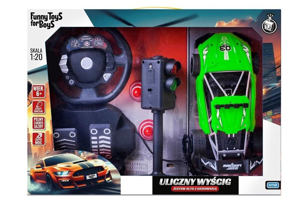 - baterie: 4 x aa (auto), 2 x aa (kierownica), 3 x ag13 (sygnalizator) niedołączone