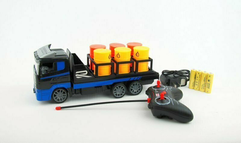Ciężarówka z funkcją zdalnego sterowania wykonana w niebiesko-czarnej kolorystyce w zestawie akcesoriami. Jest to zestaw najwyższej jakości pod względem rzeczywistego odwzorowania kształtu pojazdu. Pojazd ciężarowy posiada obrotowe koła, które sprawiają, że możemy poruszać się nim po wybranej powierzchni. Dzięki specjalnemu pilotowi porusza się w różne strony: do przodu i do tyłu oraz skręca w prawo i w lewo. Wymaga zasilania: pilot 2 bateriami AA 1.5V (nie dołączono do zestawu), ciężarówka 4 akumulatorami AA 1.5V (dołączono do zestawu). Zestaw jest idealny dla dzieci, które lubią bawić się przeróżnymi pojazdami. Zapakowany jest w kartonik z okienkiem.Zawartość:- 1 ciężarówka,- 6 beczek,- 1 pilot,- 4 akumulatory,- 1 kabel do ładowania.Wymiary opakowania: 46,5x18x11cmWiek: 3+