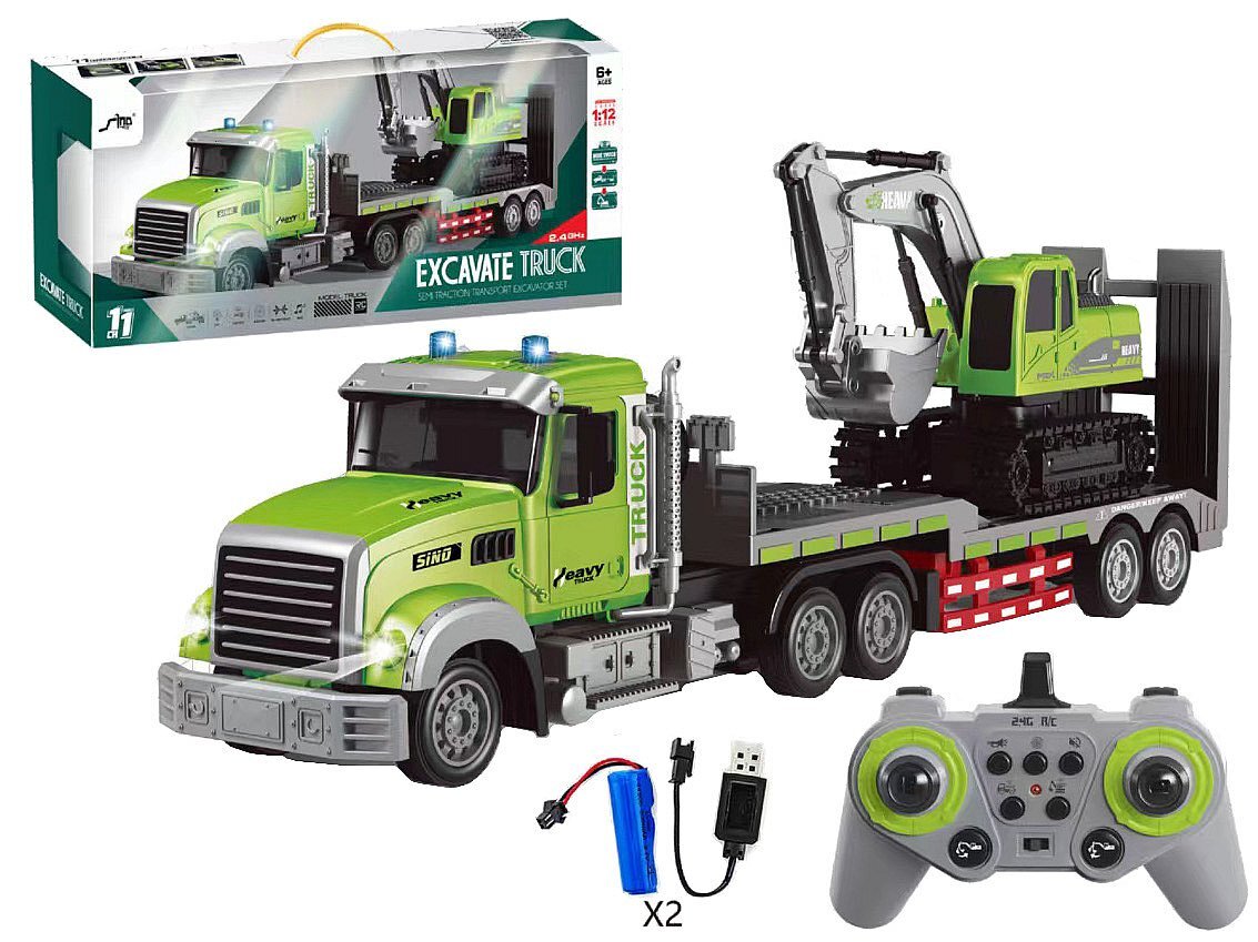 R/C auto s odtahovkou a bagrem 1:12, 11 funkcí, s baterií a nabíječkou; 60x11x20cm, W/B