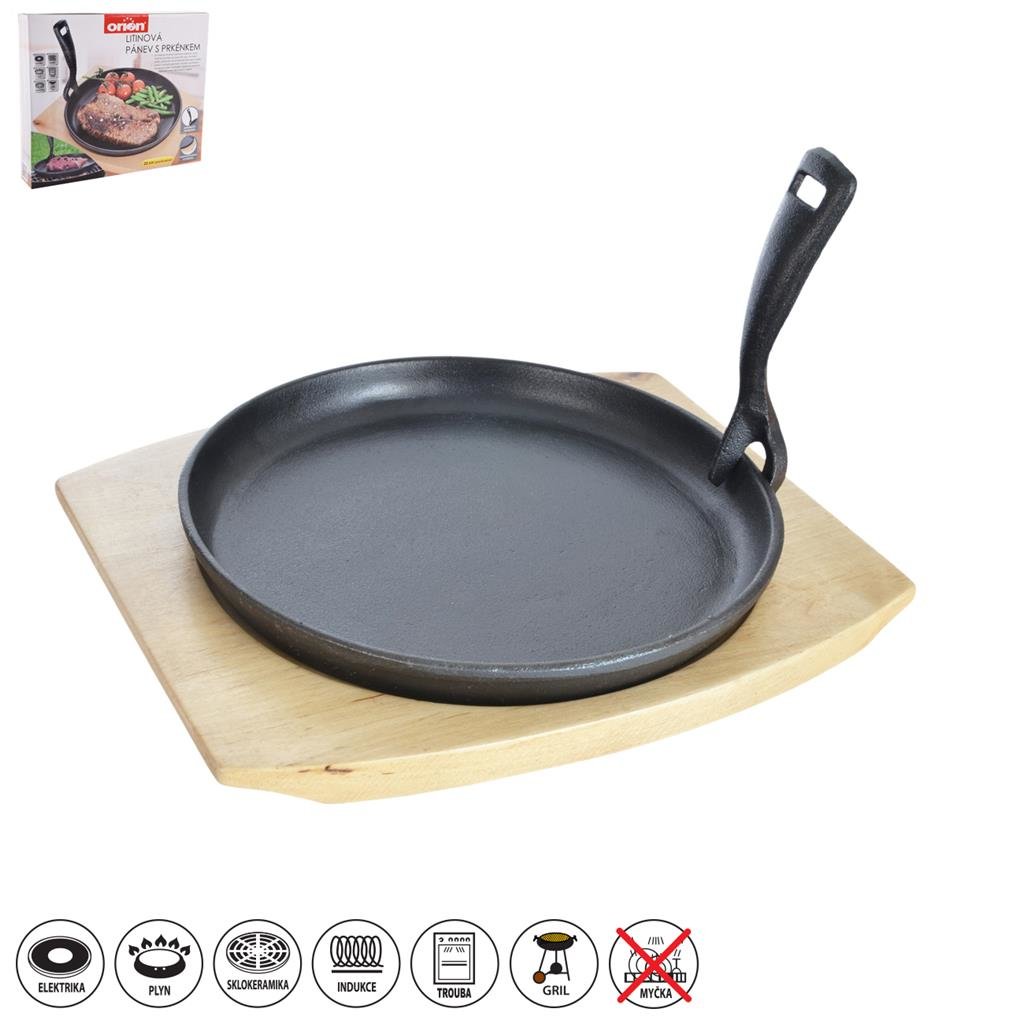 Pánev z litiny Vám pomůže při přípravě chutných pokrmů z masa, zeleniny, brambor. Pánev s hotovým pokrmem umístíte na prkénko a rovnou na ni jídlo servírujete. Ozvláštníte tak běžné stolování a podávání pokrmů. Materiál: litina. Doporučujeme používání kuchyňské chňapky. Můžete připravovat pokrmy v troubě, na sporáku i na přímém ohni. Litina je specifická na údržbu, před a po použití je NUTNÉ povrch pánve ošetřit jedlým olejem, tak se zamezí vzniku rzi. Nenechávejte ve vlhku! Rozměry: pánev pr. 22 cm, v. 2 cm, prkénko 27x23 cm. Vhodná na indukci. Nepoužívejte organické kyseliny typu octa.