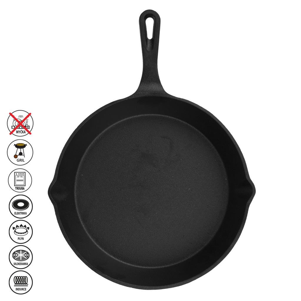 Pánev z litiny Vám pomůže při přípravě chutných pokrmů z masa, zeleniny, brambor. Pánev s hotovým pokrmem můžete umístit na jakékoli prkénko a rovnou na ní jídlo servírovat. Ozvláštníte tak běžné stolování a podávání pokrmů. Materiál: litina. Doporučujeme používání kuchyňské chňapky. Můžete připravovat pokrmy v troubě, na sporáku i na přímém ohni. Litina je specifická na údržbu, před a po použití je NUTNÉ povrch pánve ošetřit jedlým olejem, tak se zamezí vzniku rzi. Nenechávejte ve vlhku! Rozměry: pr. 25 cm, v. 5 cm. Vhodná na indukci, ale doporučujeme ověřit si možnosti vašeho indukčního vařiče. Nepoužívejte organické kyseliny typu octa.