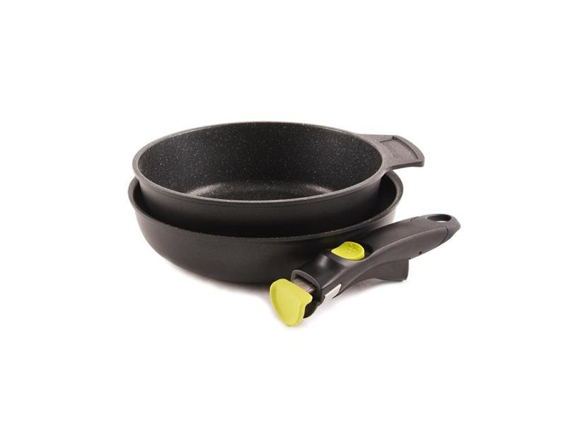 Odlévaná masivní pánev a kastról s velmi kvalitním nepřilnavým povrchem PFLUON GRANIT. Můžete na ni smažit, dusit, opékat a zapékat s minimální potřebou tuku. Vhodné na všechny typy spotřebičů včetně indukce. Lze mýt v myčce na nádobí. Doporučujeme použití kuchyňské chňapky. Odnímatelná rukojeť poskytuje mnoho výhod. Nádobí skvěle uložíte do kuchyňské linky a zabere minimum místa. Kastról můžete uložit do pánve. K tomu však doporučujeme využít podložky mezi pánve z naší nabídky, aby nedošlo k poškození povrchu. Odnímatelná rukojeť je výhodou také při vaření. Můžete ji nasadit na pánev či kastról pouze při manipulaci s nádobami a jinak ji oddělat - budete mít dostatek místa pro další nádobí na sporáku. A především je odejmutí rukojeti důležité pro pečení v troubě, do které lze dávat pouze samotné nádoby bez rukojeti. Nádobí je vhodné na všechny typy spotřebičů četně indukce. U plynových sporáků volte správnou velikost plamene, u elektrických, sklokeramických a indukčních vařičů je nutné zvolit odpovídající velikost ploténky. Připravovaný pokrm lze na sporáku připravit a pak jej vložit do trouby. Výhodou odnímatelné rukojeti je, že můžete obě nádoby použít v troubě na pečení a zapékání. Nezapomeňte ale vždy odejmout rukojeť. Není vhodná do trouby. Velmi jednoduše a rychle ji pak na nádoby opět připevníte a vyjmete je z trouby. Připravené jídlo můžete pohodlně skladovat v nádobách také v chladničce. Odnímatelná rukojeť nebude zabírat zbytečně místo. Využít můžete skleněné poklice z naší nabídky.