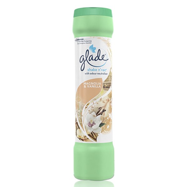 Glade Shake n\' Vac - vůně a pohlcovač pachů na kobercích - Magnolie s vanilkou - 500GrPřinášíme Vám novinku v péči o Vaše bytové koberce, předložky další textilní podlahové krytiny. Tento přípravek nejen že provoní Váš koberec, ale také pohltí nepříjemné pachy, které koberec do sebe po čase nachytá. Velmi snadné a jednoduché použití a perfektní účinek. Přípravek Glade Shake n\'vac protřepejte a následně otevřete. Lehce nakloňte a posypejte koberece (jako koláč moučkovým cukrem). Koberec doporučujeme před použitím přípravku vysát. Nechte působit několik minut (5-15) a následně vysajte vysavačem, pokud není možné vysát vysavačem vyklepejte. Přípravek není vhodný pro použití na mokré čištění, vlhké koberce apod... Skladujte na suchém místě.Balení 500ML