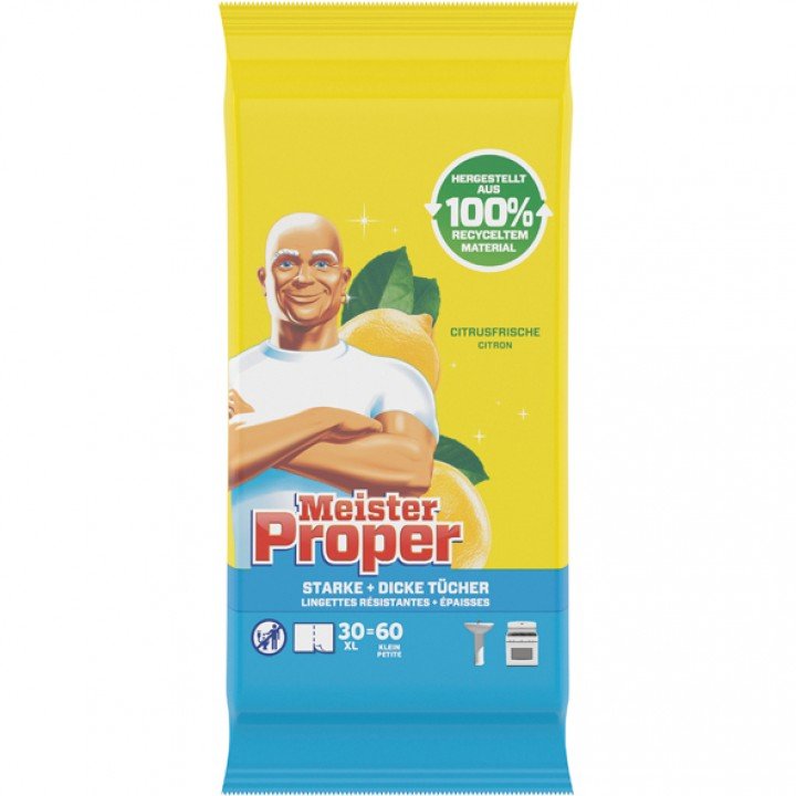 Meister Proper silné čistící ubrousky s citrusovou vůní a dvojitou perforací velikosti XL 30=60ksskvělé čistící univerzální ubrousky pro použití v kuchyni i koupelně, které si poradí jak s mastnotou tak s vodním kamenem. Tyto ubrousky jsou extra velké a mají v polovině perforaci, která zajistí, že můžete ubrousek navíc rozdělit na dva. Pro běžný a pravidelný úklid tak získáte balení s 60 ubrousky.Velice příjemná citrusová vůně, ubrousky jsou z netkané textilie a proto je není možné vhazovat do toalety!