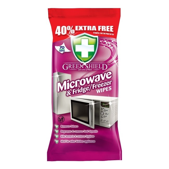 Green Shield čistící ubrousky jsou ideálním pomocníkem pro odstranění zaschlých nečistot a mastnoty z vaší mikrovlnné trouby. Už žádné namáhavé drhnutí nebo agresivní chemikálie!