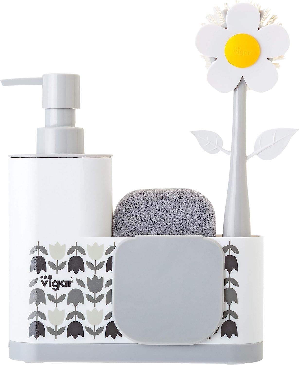 4dílná sada na dřez, včetně kartáče na drhnutí s motivem kytička, oboustranné houbičky, dávkovače mýdla a škrabky.