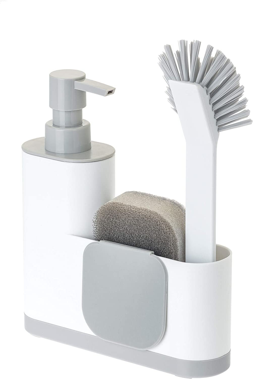 4dílná sada na dřez, včetně kartáče na drhnutí, oboustranné houbičky, dávkovače mýdla a škrabky.