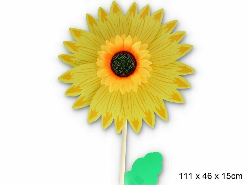 Wiatrak (słonecznik) z drewnianą rączką. Oprócz obrotowych płatków z tworzywa został wyposażony w element, który dobrze imituje prawdziwy kwiat słonecznika z poszczególnymi ziarenkami. Na długim (92 cm), drewnianym trzonku umieszczono element odwzorowujący zielony listek. Wiatrak jest idealny do ogródka i na balkon. Dzięki temu, że listki są wzmocnione przez płytki z tworzywa, produkt jest solidny i wytrzymuje mocniejsze podmuchy wiatru.Wymiary wiatraka: 39x13x113cm