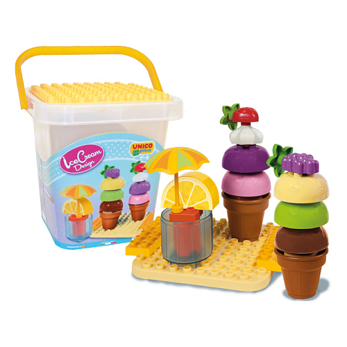 Kopečková zmrzlina v praktickém plastovém kyblíku obsahuje 25 dílků stavebnice. Vhodné pro děti od 18 měsíců věku. Vyrobeno v Itálii. Kompatibilní s dalšími stavebnicemi na trhu.