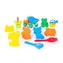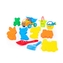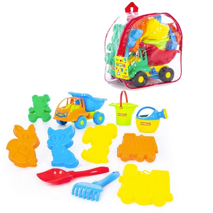Sada v batohu na písek obsahuje 11 kusů. Tvoří ji autíčko, 6 formiček, kyblíček, krhlička, hrabičky a lopatka. Prakticky se všechny hračky vejdou do batohu.