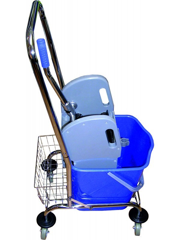Profesionální úklidový vozík na kolečkách v ekonomické variantě. Objem vědra 23 litrů. Snadné ždímání pomocí pákového systému vertikálního lisu. Otočná kolečna pro snadný pohyb všemi směry. Zadní odkládací košík. Chromovaný kovový rám vozíku. EAN 0000060059000 číst celé
