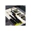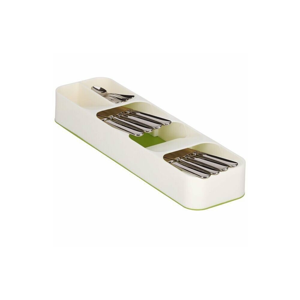 Kompaktní plastový příborník s pěti přihrádkami. Možnost umístění do zásuvky nebo na kuchyňskou linku. Protiskluzové nožičky. Poloviční úspora místa ve srovnání s klasickým příborníkem, díky ukládání příborů pod úhlem nad sebou.