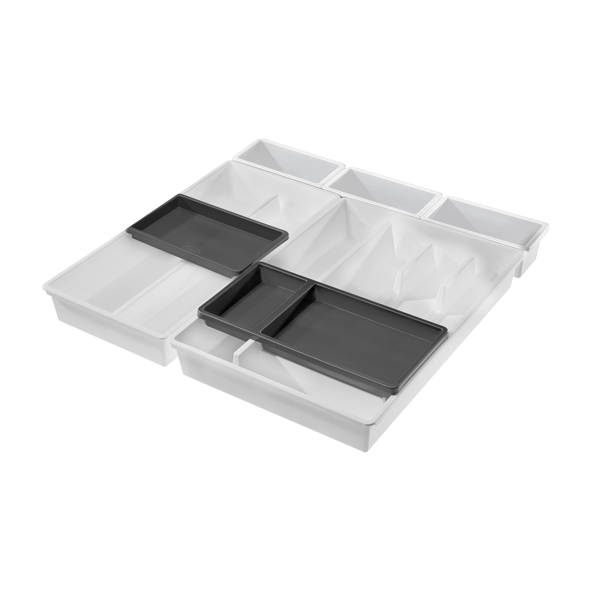 Příborník BELLA - set 7 ks - bílá/grafit;49.5X49.2XH6.7CM;objem:Tento příborník Bella se hodí do všech kuchyňských zásuvek o rozměrech 60x60 a má dvě praktické posuvné horní přihrádky a tři další nádoby, které jsou ideální pro uložení malých předmětů. číst celé