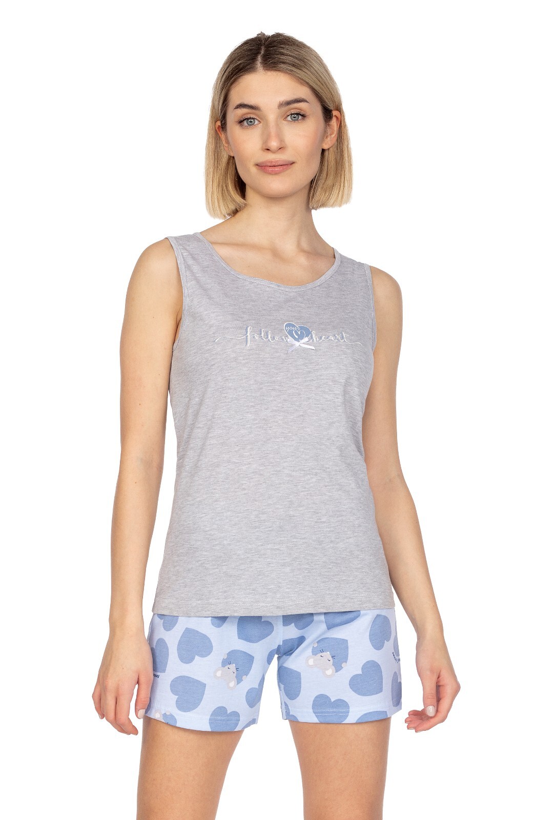 Bawełniana piżama damska- koszulka na szerokich ramiączkach- przód ozdobiony nadrukiem- dekolt okrągły- wzorzyste krótkie spodenki