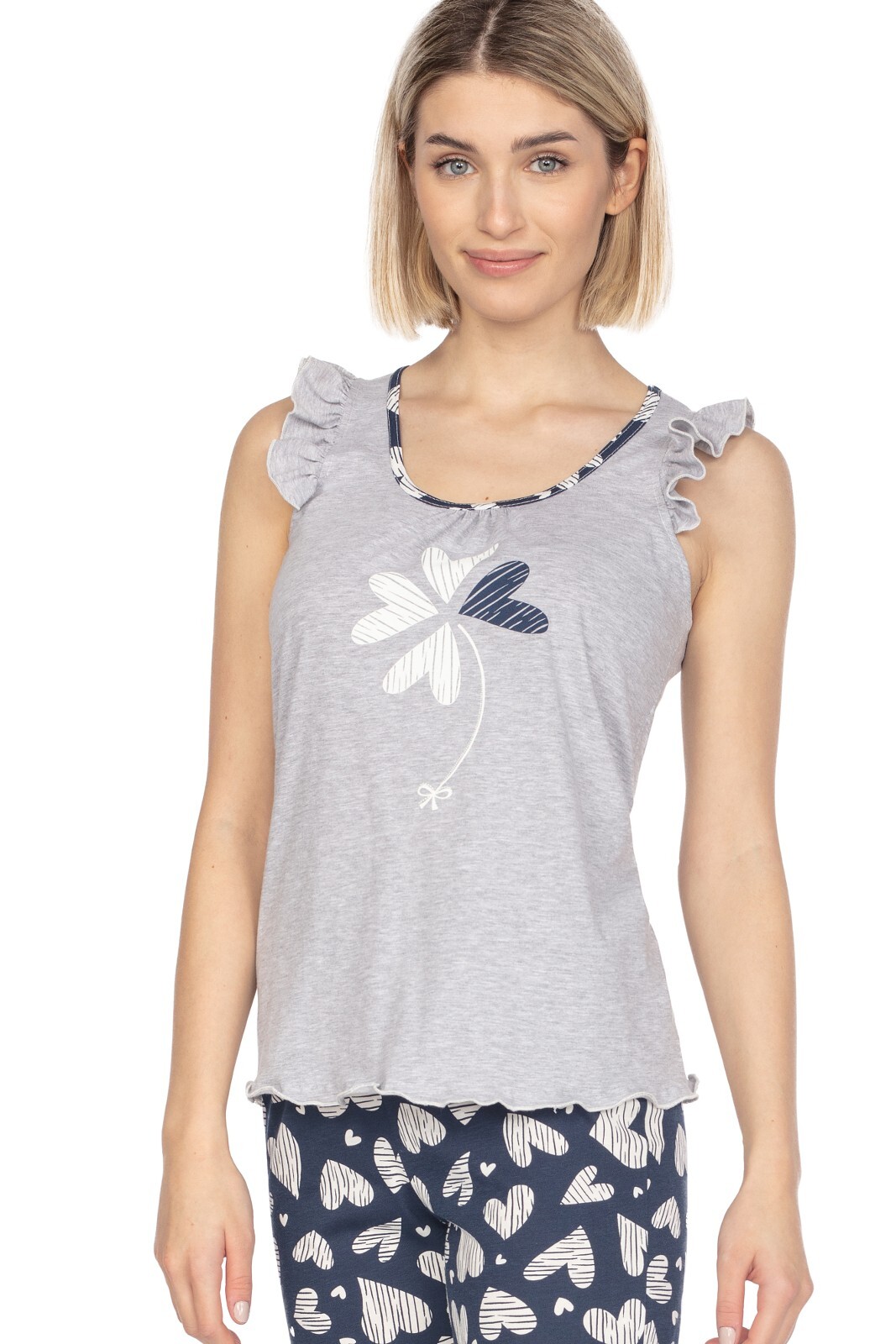 Bawełniana piżama damska- koszulka na szerokich ramiączkach z falbanką- przód ozdobiony nadrukiem- dekolt okrągły, obszyty lamówką w kolorze spodni- wzorzyste spodnie, długość 3/4