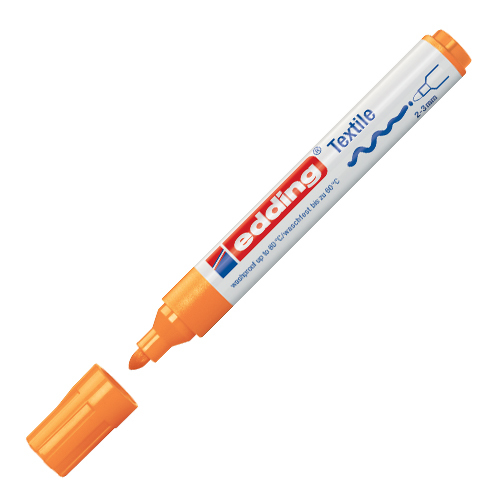Popisovač na textílie s okrúhlym hrotom strednej hrúbky. Plnený atramentom bez zápachu na báze vody. Farby treba zafixovať žehlením na sucho. Po zafixovaní sú farby odolné voči praniu do 60°C. Šírka stopy: 2-3 mm. Farba: neónovo oranžová. číst celé
