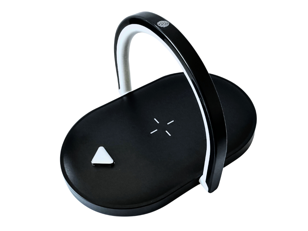 Lampa, stojan na telefon a bezdrátová nabíječka s dotykovým zapínáním lampičky s režimem tří intenzit svítivosti.