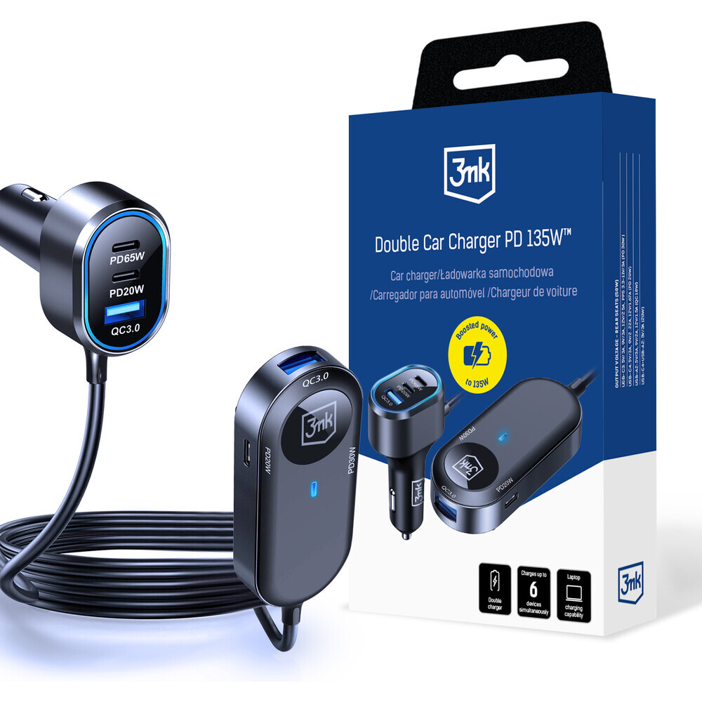 3mk Double Car Charger 135W PD QC PPS USB 2A4C nabíječka do auta černá/šedá