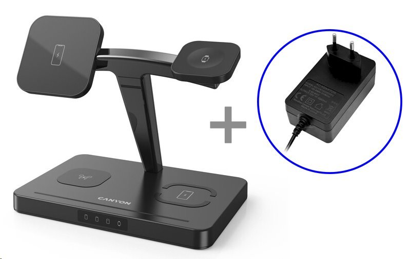 CANYON Bezdrátová nabíječka WS-404B + AC adapter, 4v1, Qi & Apple MagSafe, vstup 12V/3A, výstup 15/10/7.5/5W, černá
