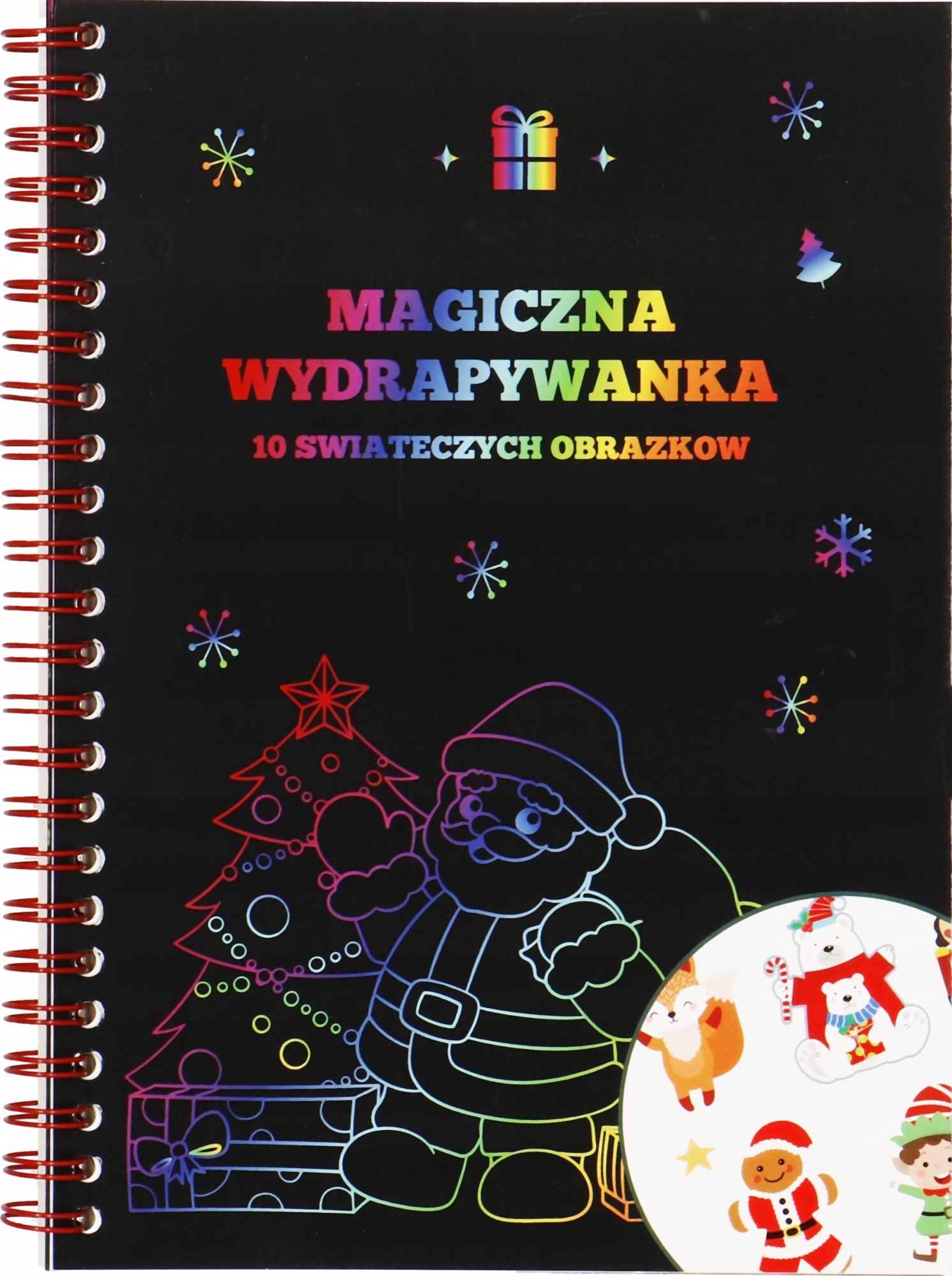 Wydrapywanka świąteczna z obrazkami + arkusz naklejek magiczny notes wydrapywanka obrazki powstają poprzez zdrapywanie czarnej warstwy powłoki, pod którą znajduje się kolorowy zadruk 10 arkuszy na spirali z naszkicowanymi obrazkami kolorowy zadruk pod czarną farbą - uwidacznia się po zdrapani czarnej farby patyczkiem dołączony arkusz pięknych świątecznych naklejek, które dzieci tak bardzo lubią drewniany rysik dołączony w zestawie świetny pomysł na prezent Mikołajkowy, na mikołajki szkolne, klasowe lub w przedszkolu
