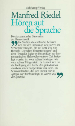 ... Diese zwischen Sprechen und Hören spielende Maßgabe des Verstehens nennen wir die akroamatische Dimension (von gr. akroasthai, hören lassen, vernehmen, auf etwas hören im Sinne von achten). Die Öffnung der akroamatischen Dimension durch die hermeneutische Philosophie unseres Jahrhunderts...