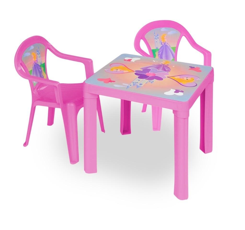 Zestaw: stolik i dwa krzesła, kolor Różowy, wtopiona etykieta IML z kolorowym motywem w blat stolika i oparcie krzesła uniemożliwa jego odklejenie i gwarantuje wysoką odporność na warunki atmosferyczne, do stosowania zarówno na zewnątrz, jak i wewnątrz číst celé