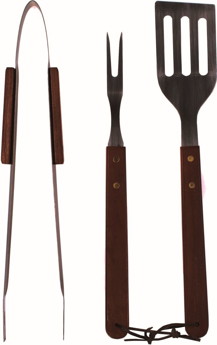 3dílná sada grilovacího náčíní obsahuje - kleště, obracečku a vidličku z nerez oceli. Rukojeť je ze dřeva - plochá. Sada obsahuje základní nářadí potřebné při grilování. Nářadí je vybaveno poutky pro zavěšení.