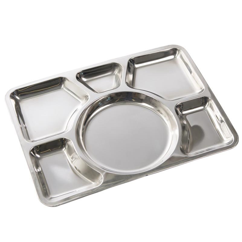 Nerezový jídelní tác. Rozměr 40 x 30 x 2 cm. Šest servírovacích oddělení pro různé chody. Hmotnost 460 gramů. Nerezové provedení. číst celé