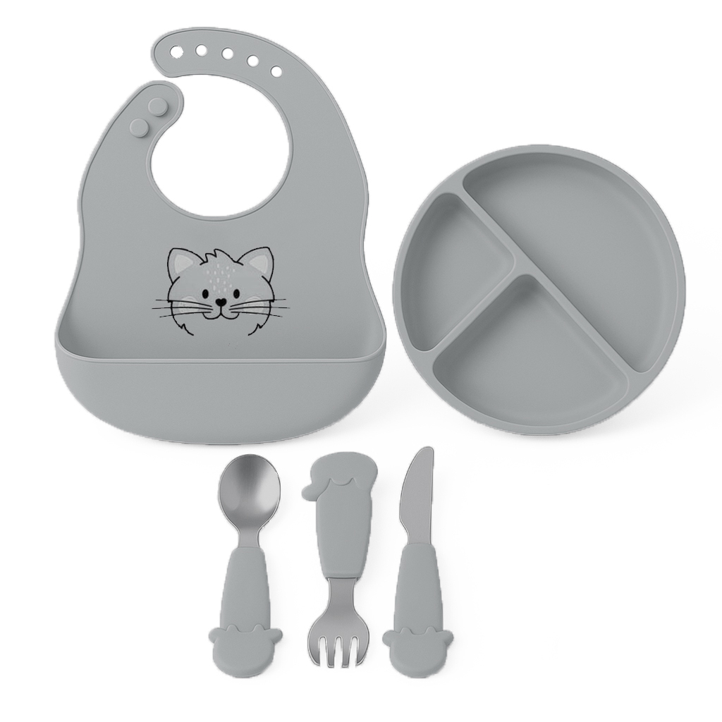 Detský silikónový set FreeON - sivý tanier, príbor a podbradník