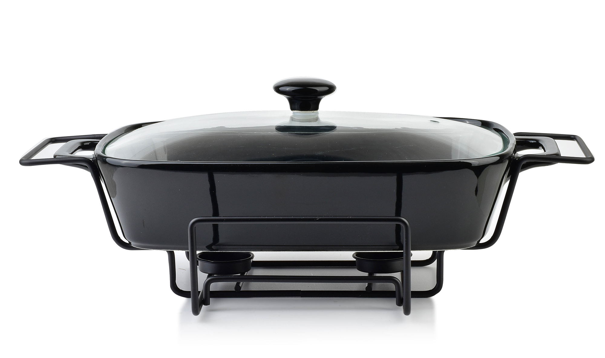 Naczynie z podgrzewaczem marki Allesken z serii MODERN KITCHEN poj. 2,1L, 38,5x22x17cm to serwowanie potraw na co dzień i od święta. . Kolor: czarny, czarny stelaż . Materiał: kamionka . . Marka: Allesken . Zastosowanie: serwowanie potraw . Pojemność produktu: 2,1L . Wymiar: 38,5x22x17cm . Symbol: HTN3164,5905771403164 . Kolekcja: MODERN KITCHENNaczynie jest idealne do serwowania najróżniejszych potraw. Stabilny stojak wykonany ze stali chromowanej umożliwia serwowanie gorącej potrawy. Dzięki podgrzewaczom serwowane dania pozostaną ciepłe przez długi czas Szklana pokrywa posiada ceramiczny uchwyt Naczynie oraz pokrywę można myć w zmywarce Stojak czyścić wilgotną ściereczką Stojak posiada miejsce na umieszczenie świeczek typu tea-light (do zestawu NIE są dołączone świeczki) INFORMACJE DODATKOWE: NIE POZOSTAWIAĆ PUSTEGO NACZYNIA NAD ŹRÓDŁEM CIEPŁA . Odporność na temperaturę do 140 stopni C . Nie umieszczać w mikrofali . Nie umieszczać w piekarniku . Naczynie służy do serwowania potraw O MARCE Allesken, znana marka charakteryzuje się niepowtarzalnymi zdobieniami oraz najwyższej jakości materiałami, dzięki czemu posłuży na długie lata. Zapakowany jednostkowo w color box.