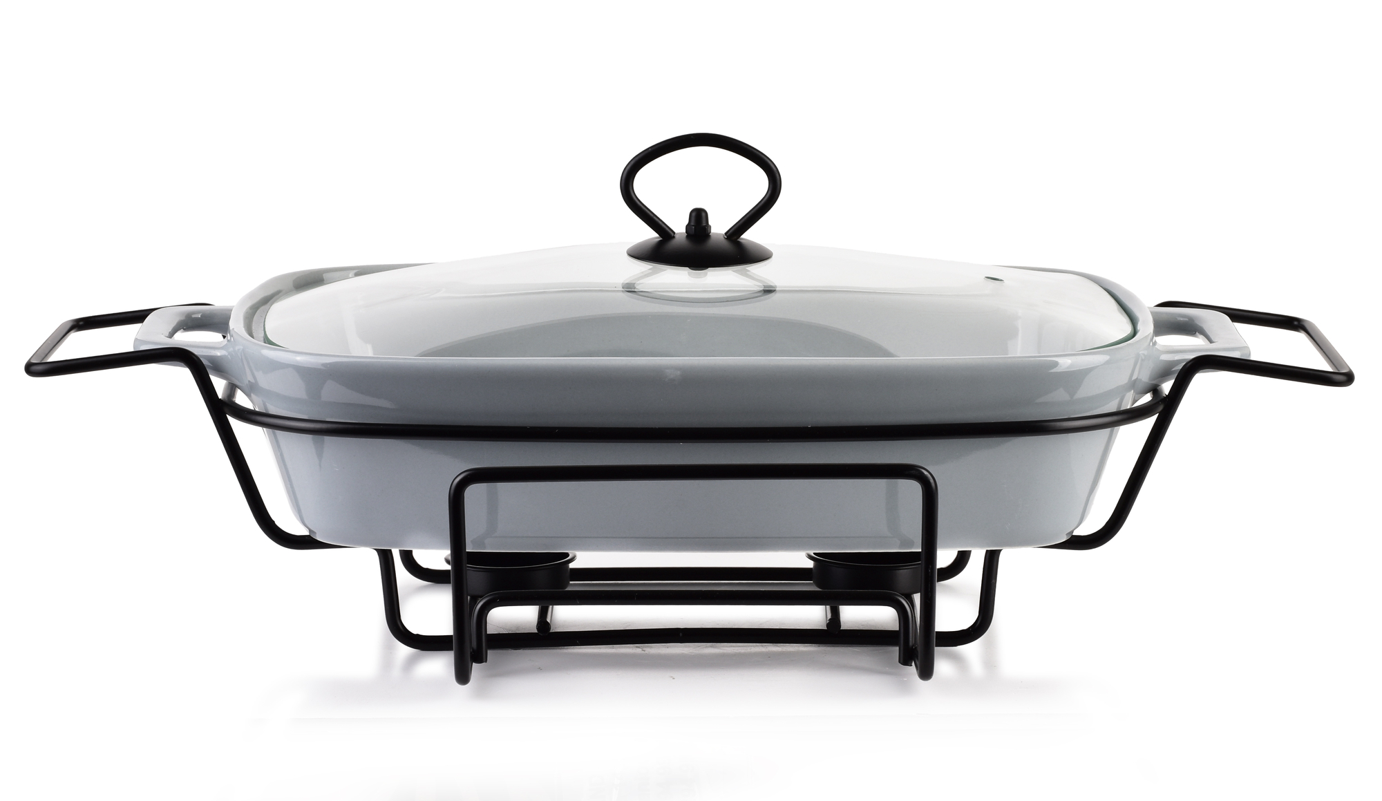 Prostokątne naczynie z podgrzewaczem marki Allesken by MONDEX z serii MODERN KITCHEN to idealne rozwiązanie do serwowania ciepłych potraw, które utrzymają swoją temperaturę. Wbudowane w metalowym stelażu miejsce na świeczki typu tea-light sprawia, że potrawy zostają ciepłe przez długi czas, co czyni ten produkt niezastąpionym podczas spotkań i przyjęć. Zestaw 3 elementów: naczynia ceramicznego, metalowego stelaża i szklanej pokrywy wykonany z wysokiej jakości materiałów. Naczynie zachwyca nowoczesnym designem, który świetnie wpasuje się w każdą jadalnię, dodając jej elegancji.Trwałe materiały, z których wykonano naczynie, gwarantują długotrwałe użytkowanie. Allesken by MONDEX łączy w sobie elegancję i funkcjonalność, oferując produkt, który pozwoli cieszyć się gorącymi potrawami przez cały czas trwania posiłku.Zestaw posiada eleganckie opakowanie, co sprawia że naczynie jest doskonałym upominkiem.Naczynia nie zaleca się myć w zmywarce, szklaną pokrywę myć ręcznie, stojak czyścić wilgotną ściereczką.Można używać w piekarniku w temperaturze do 140C.Nie można używać w mikrofali.Nie można myć w zmywarce.Nie pozostawiać pustego naczynia nad zapalonymi świecami.Podgrzewać maksymalnie do 140C.Naczynie na 2 świeczki typu tea-light. Opakowanie nie zawiera świeczek w zestawie. Wymiary naczynia ceramicznego:Długość: 41,5cm Szerokość: 25,6cm Wysokość: 15cm Pojemność: 2,1l