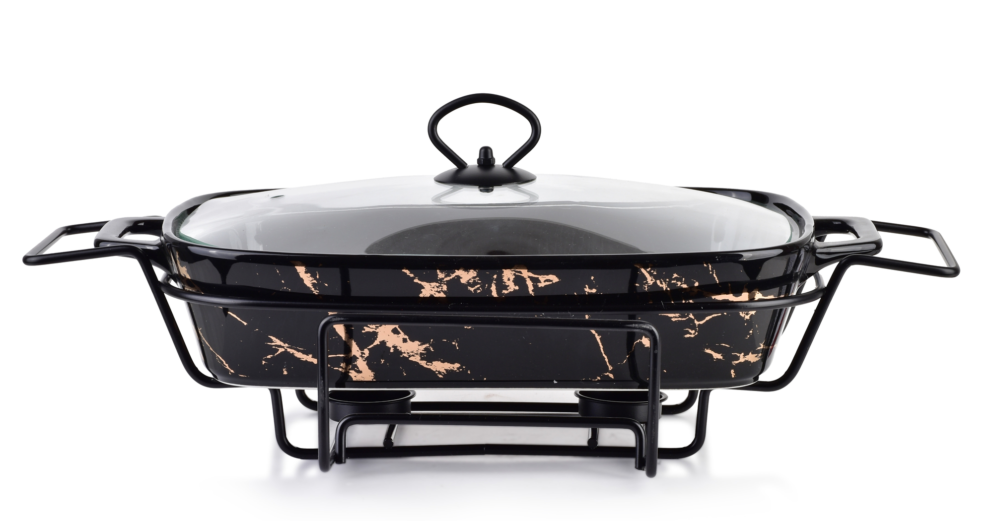 Prostokątne naczynie z podgrzewaczem marki Allesken by MONDEX z serii MODERN KITCHEN to idealne rozwiązanie do serwowania ciepłych potraw, które utrzymają swoją temperaturę. Wbudowane w metalowym stelażu miejsce na świeczki typu tea-light sprawia, że potrawy zostają ciepłe przez długi czas, co czyni ten produkt niezastąpionym podczas spotkań i przyjęć. Zestaw 3 elementów: naczynia ceramicznego, metalowego stelaża i szklanej pokrywy wykonany z wysokiej jakości materiałów. Naczynie zachwyca nowoczesnym designem, który świetnie wpasuje się w każdą jadalnię, dodając jej elegancji.Trwałe materiały, z których wykonano naczynie, gwarantują długotrwałe użytkowanie. Allesken by MONDEX łączy w sobie elegancję i funkcjonalność, oferując produkt, który pozwoli cieszyć się gorącymi potrawami przez cały czas trwania posiłku.Zestaw posiada eleganckie opakowanie, co sprawia że naczynie jest doskonałym upominkiem.Naczynia nie zaleca się myć w zmywarce, szklaną pokrywę myć ręcznie, stojak czyścić wilgotną ściereczką.Można używać w piekarniku w temperaturze do 140C.Nie można używać w mikrofali.Nie można myć w zmywarce.Nie pozostawiać pustego naczynia nad zapalonymi świecami.Podgrzewać maksymalnie do 140C.Naczynie na 2 świeczki typu tea-light. Opakowanie nie zawiera świeczek w zestawie. Wymiary naczynia ceramicznego:Długość: 41,5cmSzerokość: 25,6cmWysokość: 15cm Pojemność: 2,1l