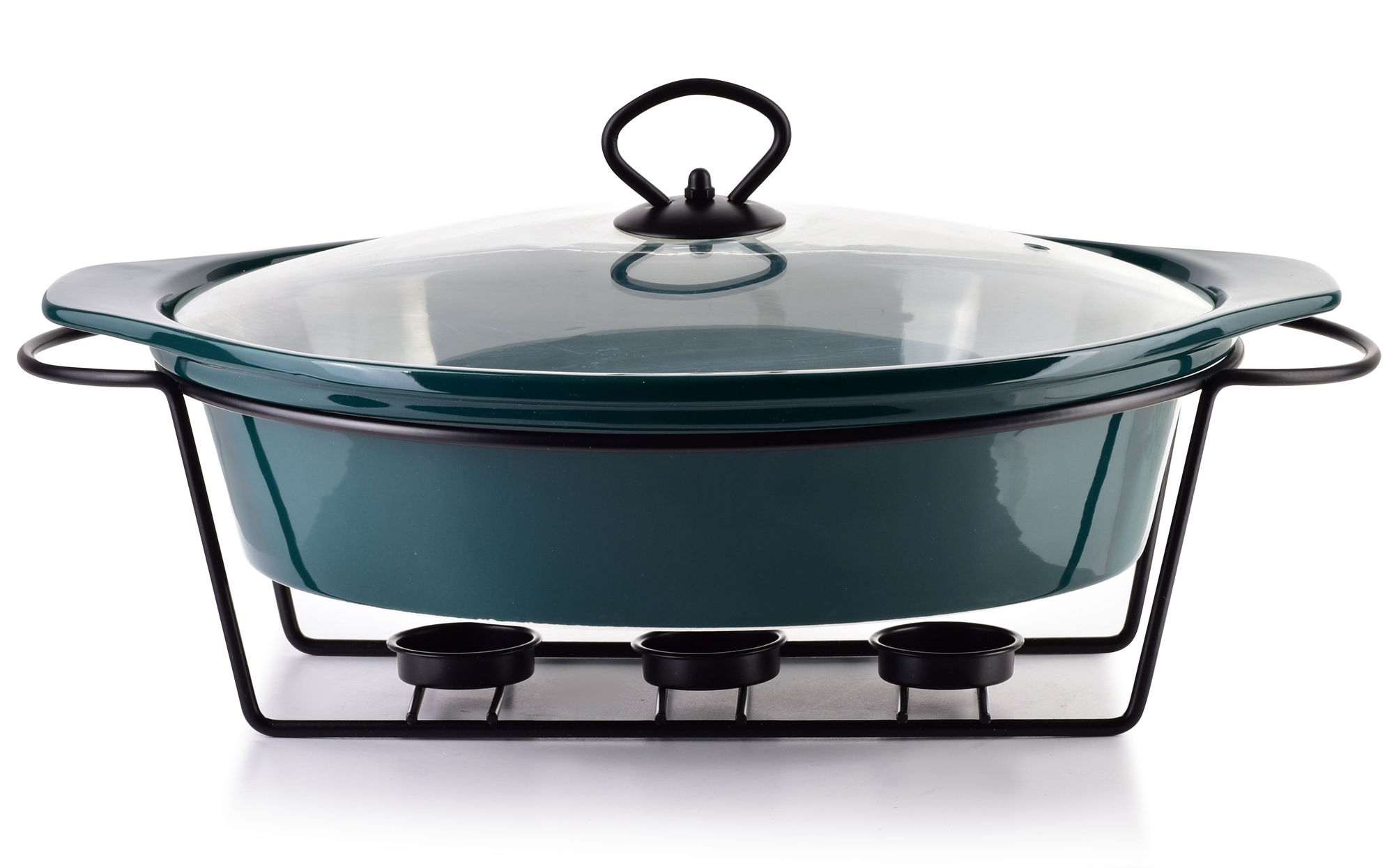 Naczynie z podgrzewaczem marki Allesken z serii MODERN KITCHEN poj. 2,3L, 34x25xh17cm to serwowanie potraw na co dzień i od święta.. Kolor: ciemny zielony, czarny stelaż . Materiał: kamionka . Marka: Allesken . Zastosowanie: serwowanie potraw . Pojemność produktu: 2,6L . Wymiar: 34x25xh17cm . Symbol: HTN5526,5905771405526 . Kolekcja: MODERN KITCHENNaczynie jest idealne do serwowania najróżniejszych potraw. Stabilny stojak wykonany ze stali chromowanej umożliwia serwowanie gorącej potrawy. Dzięki podgrzewaczom serwowane dania pozostaną ciepłe przez długi czas Szklana pokrywa posiada ceramiczny uchwyt Naczynie oraz pokrywę można myć w zmywarce Stojak czyścić wilgotną ściereczką Stojak posiada miejsce na umieszczenie świeczek typu tea-light (do zestawu NIE są dołączone świeczki). Zapakowany jednostkowo w kolor box 39,3x27,7xh12,8cm