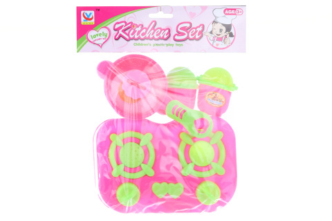 Plastová sada nádobí obsahující vařič, hrnec, pánev, příbory a další doplňky. Rozměr balení 25 x 21,5 cm. Věk 3+