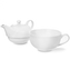 Čajová souprava se skládá z hrnečku a konvičky, které se skládají do sebe. Materiál: porcelán. Rozměry: celková výška 12 cm, hrneček - pr. 11 cm, v. 6 cm, objem 0,38 l, konvička - pr. 11 cm, v. 9 cm, objem 0,44 l. Lze použít myčku na nádobí i MVT.