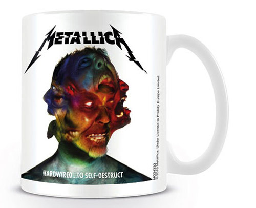 Oficiální hrnek a doplňkové zboží z katalogu produktů s logem, fotografiemi a grafikou americké metalové skupiny Metallica.