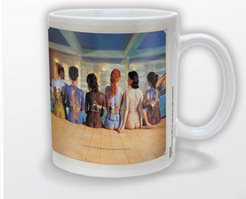 Bílý, keramický glazovaný hrnek s barevným potiskem šestice ženy, které mají na zádech graficky ztvárněné obaly alb slavné britské hudební skupiny Pink Floyd.
