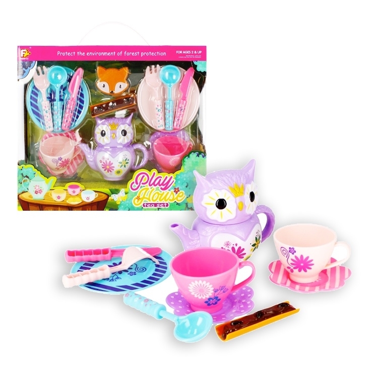 Sada obsahuje: rychlovarnou konvici s grafikou sovy, 2 x talířek, 2 x talířek, 2 x šálek, 2 x soupravu příborů, sušenky. Všechny prvky jsou vyrobeny z plastu.