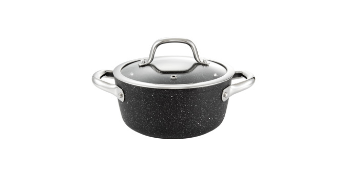 Luxusní nádobí s prvotřídním antiadhezním povlakem vhodným pro kovové kuchyňské nářadí. Pokrmy se na nepřilnavém povrchu s charakterem neleštěného přírodního kamene nepřipalují, vaření je rychlé a rovnoměrné. Masivní sklonerezová poklice s otvorem pro páru, vodotěsné nerezové úchyty a indukční dno. Vhodné pro všechny typy sporáků a pečicích trub (s poklicí max. 200 °C). Vhodné do myčky. 5 roků záruka.