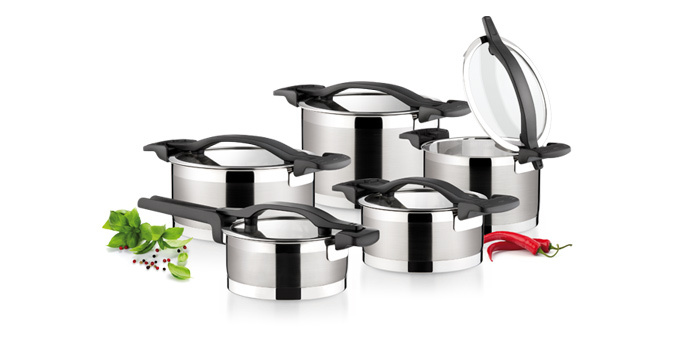 Luxusní kuchyňské nádobí s revolučním systémem regulace páry a cezení. Unikátní sklonerezové poklice se 3 pracovními polohami: 1. ŽÁDNÝ OTVOR PRO PÁRU pro rychlé dosažení varu a ohřívání pokrmů s úsporou energie, 2. MALÝ OTVOR PRO PÁRU pro komfortní vaření bez překypění a cezení nadrobno krájené zeleniny, 3. VELKÝ OTVOR PRO CEZENÍ brambor, těstovin a pro intenzivní vaření bez překypění. Poklici lze odkládat do úchytů, pára stéká zpět do nádobí. Opatřeno extra silným sendvičovým dnem, stupnicí pro snadné odměřování a úchyty z odolného plastu. Vyrobeno z prvotřídní nerezavějící oceli 18/10, vhodné pro všechny typy sporáků - plynové, elektrické, sklokeramické a indukční, vhodné do myčky. 5 roků záruka.