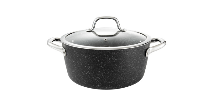 Luxusní nádobí s prvotřídním antiadhezním povlakem vhodným pro kovové kuchyňské nářadí. Pokrmy se na nepřilnavém povrchu s charakterem neleštěného přírodního kamene nepřipalují, vaření je rychlé a rovnoměrné. Masivní sklonerezová poklice s otvorem pro páru, vodotěsné nerezové úchyty a indukční dno. Vhodné pro všechny typy sporáků a pečicích trub (s poklicí max. 200 °C). Vhodné do myčky. 5 roků záruka.