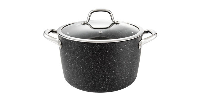 Luxusní nádobí s prvotřídním antiadhezním povlakem vhodným pro kovové kuchyňské nářadí. Pokrmy se na nepřilnavém povrchu s charakterem neleštěného přírodního kamene nepřipalují, vaření je rychlé a rovnoměrné. Masivní sklonerezová poklice s otvorem pro páru, vodotěsné nerezové úchyty a indukční dno. Vhodné pro všechny typy sporáků a pečicích trub (s poklicí max. 200 °C). Vhodné do myčky. 5 roků záruka.