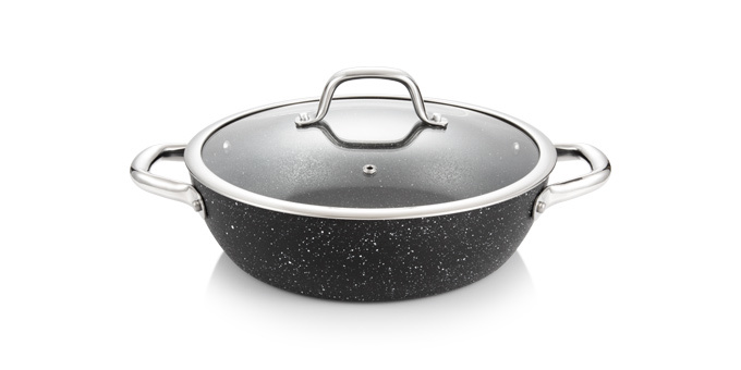 Luxusní nádobí s prvotřídním antiadhezním povlakem vhodným pro kovové kuchyňské nářadí. Pokrmy se na nepřilnavém povrchu s charakterem neleštěného přírodního kamene nepřipalují, vaření je rychlé a rovnoměrné. Masivní sklonerezová poklice s otvorem pro páru, vodotěsné nerezové úchyty a indukční dno. Vhodné pro všechny typy sporáků a pečicích trub (s poklicí max. 200 °C). Vhodné do myčky. 5 roků záruka.
